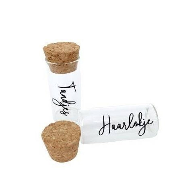 Deze glazen potjes hebben een opdruk met de tekst eerste tandjes & eerste haarlokje. De potjes sluit je doormiddel van een kurk dop en kan je weg bergen om later als herinnering aan je kleintje te geven.