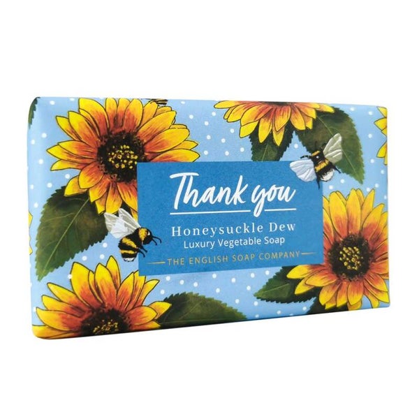 De Honeysuckle Dew - Thank You zeep is geparfumeerd met zoete tonen van kamperfoelie en waterlelie, met milde tinten van citrus en oranjebloesem. Prachtige bijen zoemen over, samen met de hand geïllustreerde zonnebloemen op deze prachtige papieren verpakking.