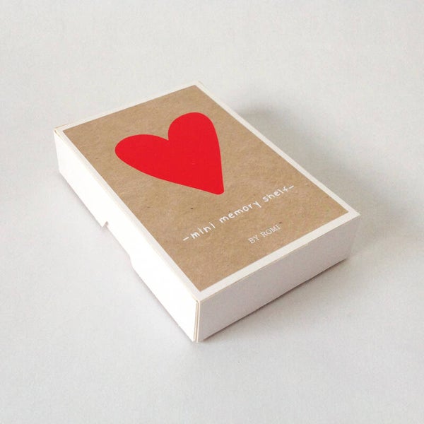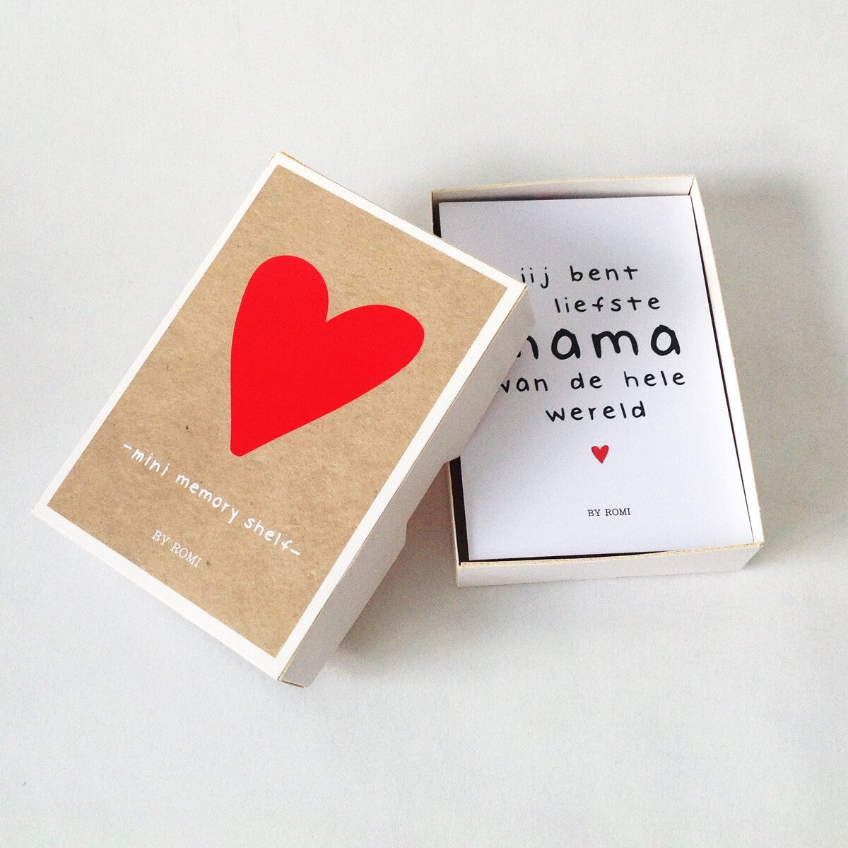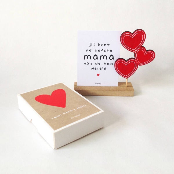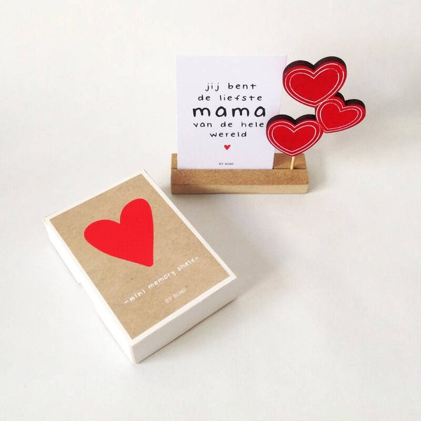 In dit lieve doosje van By Romi zit een mini Memory Shelf, een kaartje en prikker met hartjes. Op de achterzijde van het kaartje kan een lief berichtje geschreven worden.Afmeting: 8 x 11,5 x 2,5 cm
