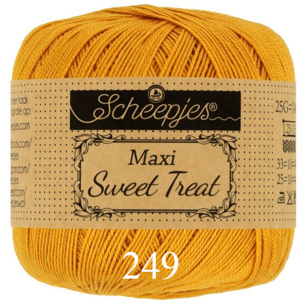 Scheepjes Maxi Sweet Treat is evenals Scheepjes Maxi Sugar Rush een zeer fijn (garendikte Lace) gemerceriseerd garen van 100% katoen. Scheepjes Maxi Sweet Treat heeft een subtiel glansje en een sterk getwijnde draad, waardoor het brei- of haakwerk een fraaie gladde afwerking krijgt. Dit fijne garen is ideaal voor opengewerkte brei- of haakpatronen, zoals ajourbreien, kantbreien of filethaakwerk, maar natuurlijk ook voor luchtige kleding of accessoires. Bij de productie is gebruikgemaakt van een volledig biologische afvalwaterzuivering, waardoor het gebruikte water op een veilige manier wordt gerecycled en hergebruikt. Scheepjes Maxi Sweet Treat heeft het EN 71-3 keurmerk, wat aangeeft dat dit garen veilig is in gebruik voor personen met een gevoelige huid en met name voor speelgoed voor baby's en kinderen. Dat maakt dit garen tot een verantwoorde keus voor bijvoorbeeld babydekentjes, knuffels of amigurumi. Scheepjes Maxi Sweet Treat, Maxi Sugar Rush en Maxi zijn identieke garens, maar elk met een andere looplengte. Scheepjes Maxi Sweet Treat is verkrijgbaar in 87 verschillende kleuren. De aanbevolen naalddikte is 1.25-1.50mm. Een bol weegt 25 gram en heeft een looplengte van 140 meter.
